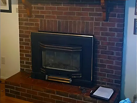 Installed electric fireplace insert, stone panels, granite hearth and added new fireplace door.