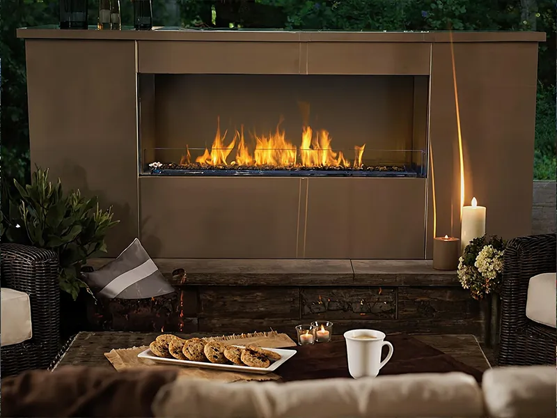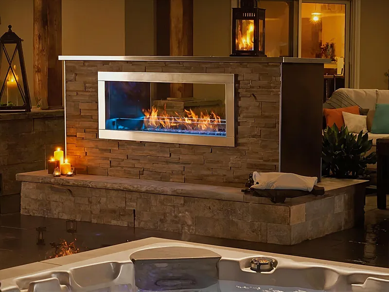 Many outdoor options are available: wood burning fireplaces, indoor/outdoor gas fireplaces, and gas fireplaces in a variety of styles and sizes, with some that don't require any venting!
